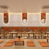 Không gian được chia thành hai dải chính, tạo lối đi trung tâm thông thoáng. Bên trái là hệ bàn ghế tiêu chuẩn, phù hợp nhóm khách đi theo cặp hoặc nhóm nhỏ. Bên phải là khu ngồi bệt nâng cốt, tạo trải nghiệm khác biệt và tăng số lượng chỗ ngồi.