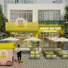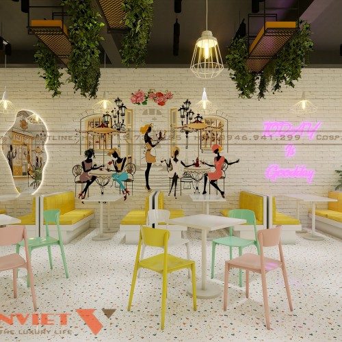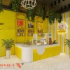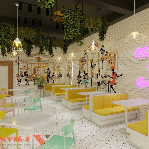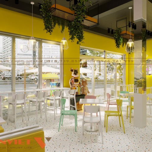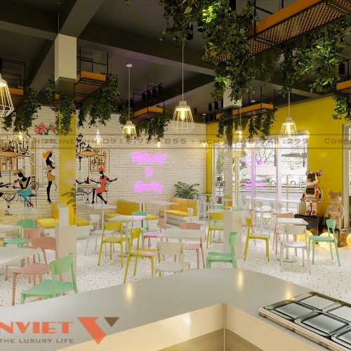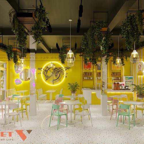 Bước chân vào bên trong thiết kế quán ăn vặt Gợi Nhớ Quán, bạn như bước vào thế giới màu sắc đầy năng lượng. Tông màu chủ đạo là vàng chanh tươi sáng, kết hợp các chi tiết hồng baby, xanh mint, trắng sữa mang đến tổng thể hài hòa và dễ chịu. Đây là cách phối màu rất thông minh, vừa trẻ trung lại không gây rối mắt.