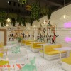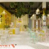 Trên trần, những mảng xanh treo thả tạo hiệu ứng “khu vườn treo” làm dịu ánh sáng và đem đến cảm giác gần gũi với thiên nhiên giữa lòng đô thị. Hệ thống đèn thả kiểu lồng sắt màu vàng ánh ấm, tạo nên ánh sáng vừa đủ, không quá gắt, thích hợp cho các buổi hẹn hò, tụ tập bạn bè, làm việc.