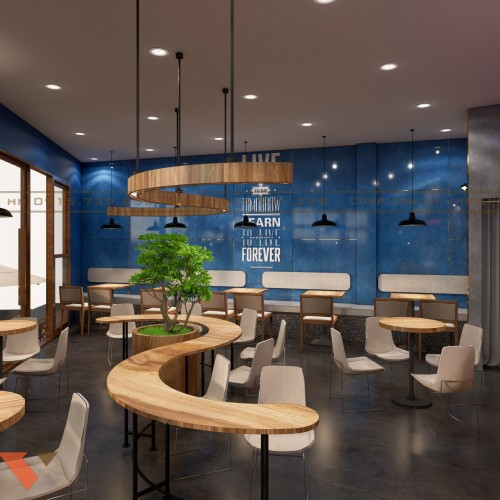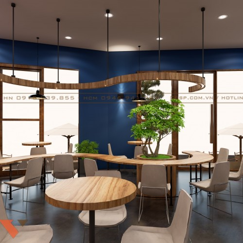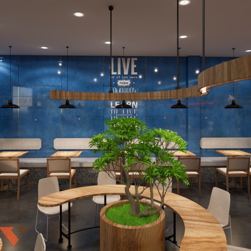Không gian bên trong là sự kết hợp nhuần nhuyễn giữa chất liệu gỗ ấm áp và tông xanh navy hiện đại, mang lại cảm giác vừa gần gũi vừa sang trọng. Bàn ghế được lựa chọn đa dạng, bố trí khéo léo để đáp ứng mọi nhu cầu. Đặc biệt, cụm bàn trung tâm uốn cong ôm lấy mảng cây xanh vừa là điểm nhấn trang trí vừa khơi gợi cảm giác thư thái giữa không gian thành thị.