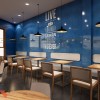 Tường bên trái được phủ lớp sơn bê tông mài xám kết hợp tranh ảnh đen trắng mang dấu ấn hoài niệm. Trong khi đó, phía sau quầy pha chế là một mảng lam sóng dọc màu xanh phối cùng bảng hiệu logo thương hiệu tạo điểm nhấn.