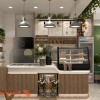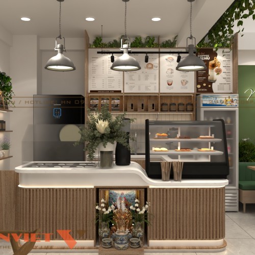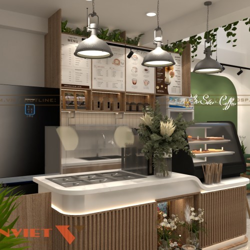 Thiết kế quầy pha chế mang vẻ hiện đại với mặt bàn ốp đá trắng, phần chân quầy làm từ các thanh gỗ lam dọc tạo hiệu ứng thị giác vừa thẳng hàng vừa mềm mại. Các thiết bị máy móc được bố trí ngăn nắp như máy pha cafe, máy xay, tủ giữ lạnh, máy làm đá. Một phần tủ kính nhỏ phía trước dùng để trưng bày các loại bánh ngọt, snack kèm theo tạo thêm điểm nhấn hấp dẫn cho quầy.