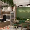 Dễ thấy rằng, cây xanh xuất hiện ở rất nhiều vị trí trong quán từ các giỏ cây treo gần trần nhà, những chậu nhỏ đặt ở chân quầy, kệ tường, cho đến bức tường xanh phía sau góc ngồi. Việc sử dụng cây xanh không chỉ làm dịu mắt mà còn mang đến cảm giác sinh động, thân thiện cho tổng thể nội thất.