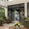 Từ góc nhìn phía ngoài, “Nhà Sóc” không cố gắng trở thành một quán cafe nổi bật về biển hiệu hay màu sắc. Thay vào đó, tông xanh rêu kết hợp cùng hệ mái vòm cổ điển và bảng menu viết tay trên bảng đen mang lại cảm giác mộc mạc, gần gũi. Không gian mở với cửa chính rộng lớn, có thể gấp mở linh hoạt, tạo cảm giác thông thoáng cho khu vực bên trong và giúp kết nối quán với phố xá bên ngoài.