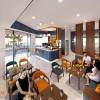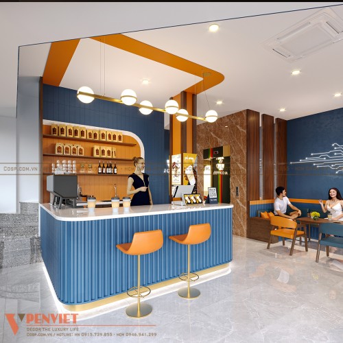 Bên trong không gian quán cafe TIDO được thiết kế với gam màu xanh dương kết hợp điểm nhấn cam trẻ trung, sành điệu. Ngay cửa ra vào là quầy pha chế, phục vụ khách hàng có nhu cầu thưởng thức cafe khi đến quán. PenViet còn khéo léo bố trí khu vực này trở thành quầy bar mini ấn tượng để khách hàng có thể trải nghiệm sự chuyên nghiệp của nhân viên khi pha chế cafe.