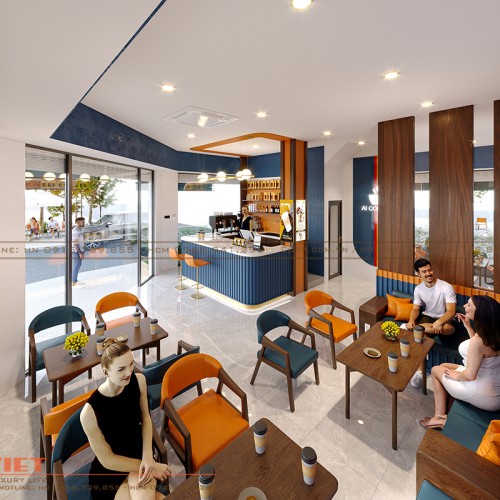 Tiếp đến là khu vực khách hàng ngồi thưởng thức cafe trên những bộ sofa dài hay sofa đơn thiết kế hiện đại. Bàn ghế gỗ được bọc đệm màu sắc cam, xanh mang đến cảm giác vừa gần gũi vừa hiện đại, phù hợp mọi đối tượng khách hàng. Bức tường phía sau được sơn phủ màu xanh ấn tượng kết hợp tranh dán tường logo bằng mica không đèn.