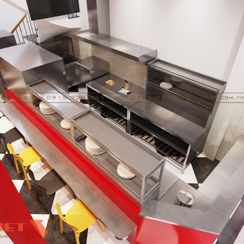 Ngoài ra, quầy còn tích hợp hệ thống lấy thức ăn trực tiếp từ bếp sang khu vực phục vụ, giúp rút ngắn thời gian và tăng hiệu quả hoạt động.