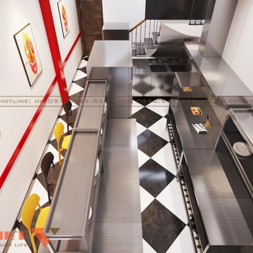 Lối đi chính được thiết kế rộng rãi, vuông góc giữa bếp, khu vực khách và cửa ra vào. Cầu thang đặt sát tường tạo sự gọn gàng, đồng thời giữ cho trung tâm quán luôn thông thoáng.