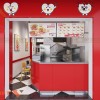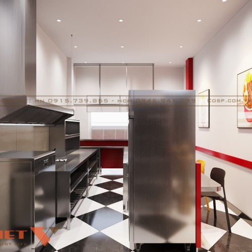 Tông màu đỏ rực là điểm nhấn bao phủ toàn bộ quầy bếp đậm chất thương hiệu và kích thích thị giác. Màu đỏ đại diện cho sự năng động, sôi nổi mà còn có tác dụng kích thích vị giác, thích hợp sử dụng trong các không gian ăn uống. Toàn bộ quầy bếp và bề mặt tiếp xúc đều được làm từ inox hoặc thép không gỉ với độ bền cao, khả năng chống ẩm mốc và dễ lau chùi.