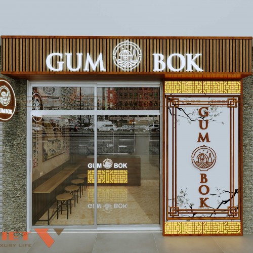 Phía mặt trước của quầy thu ngân có dán logo “GUM BOK” tăng nhận diện thương hiệu. Bên cạnh đó là các hoa văn cách điệu theo phong cách Hàn Quốc kèm ánh sáng vàng LED tạo điểm nhấn.