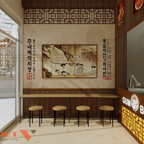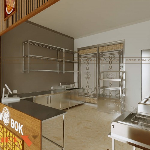 Phía trên quầy phục vụ là hệ thống tranh poster món ăn nổi bật, kích thích vị giác và tạo sự tò mò cho thực khách. Đèn led ở quầy thu ngân không chỉ có chức năng chiếu sáng mà còn như một điểm nhấn thu hút ánh nhìn, giúp định vị thương hiệu “GUM BOK” rõ ràng.