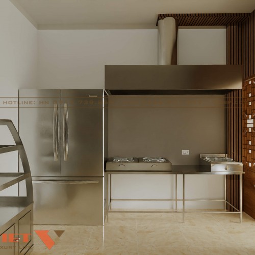 Tủ bếp và khu chế biến bằng inox sáng bóng tăng hiệu quả vệ sinh và mang lại sự chuyên nghiệp trong không gian bếp.