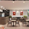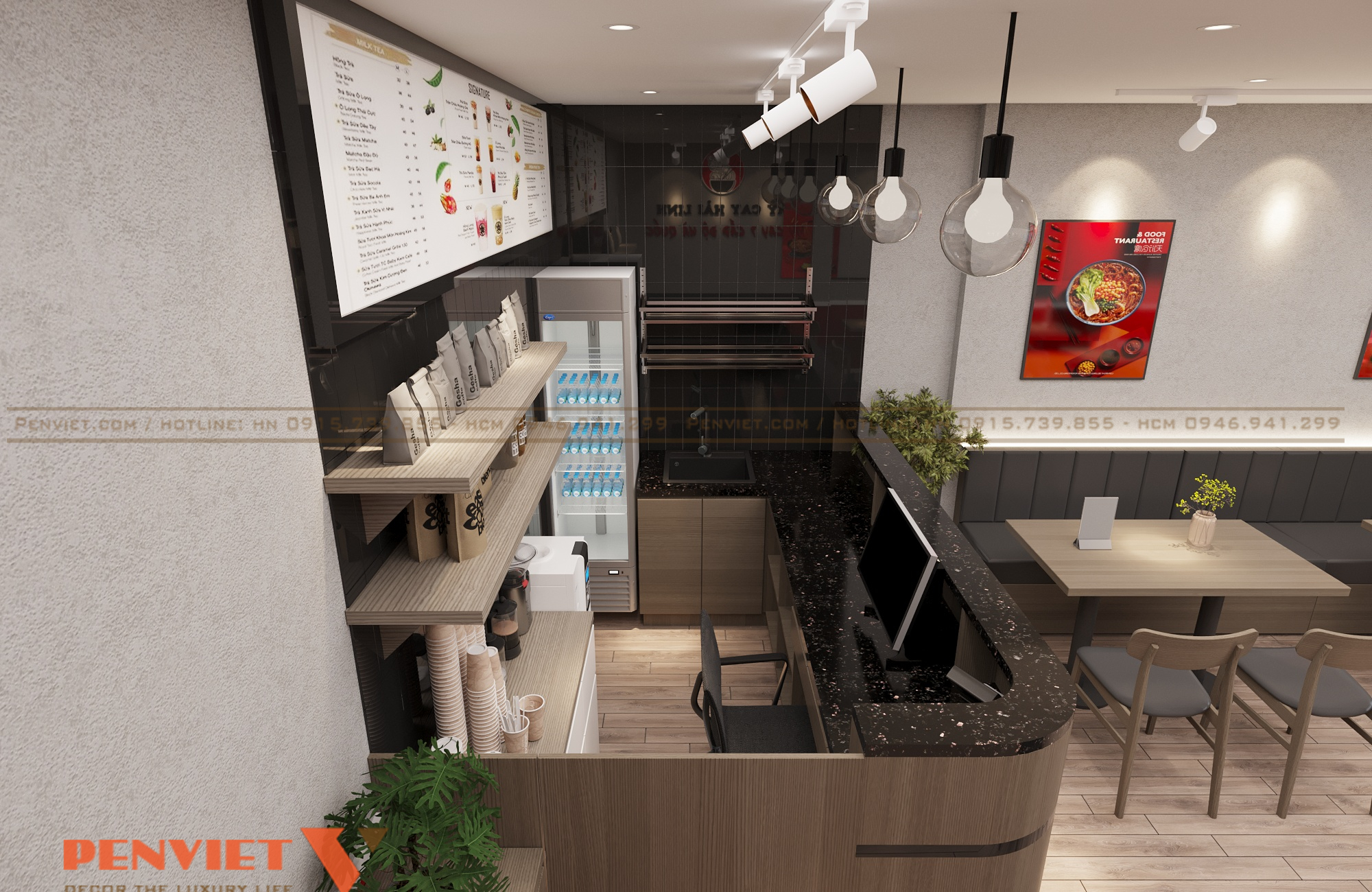 Khu vực quầy bar được đặt ở vị trí trung tâm gần cửa ra vào, vừa thuận tiện cho nhân viên thao tác, vừa dễ quan sát khách hàng ra vào quán. Thiết kế quầy theo đường cong mềm mại tạo sự thân thiện, tránh cảm giác khô cứng. Mặt quầy được ốp gỗ kết hợp nẹp đen tinh tế, mang lại vẻ hiện đại và chuyên nghiệp.
