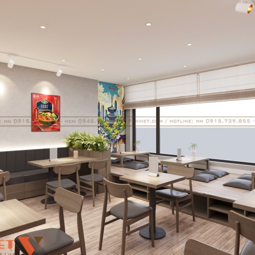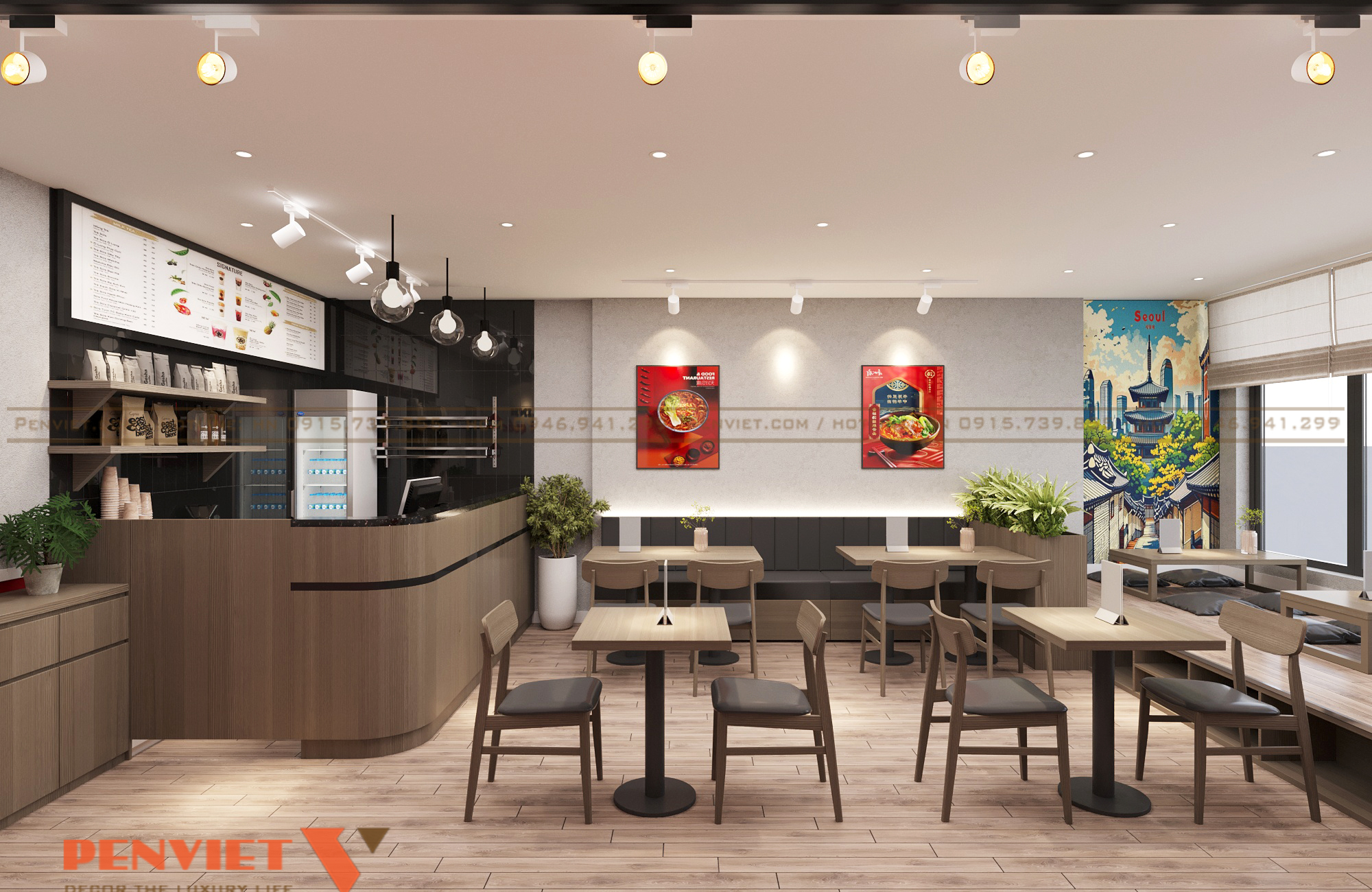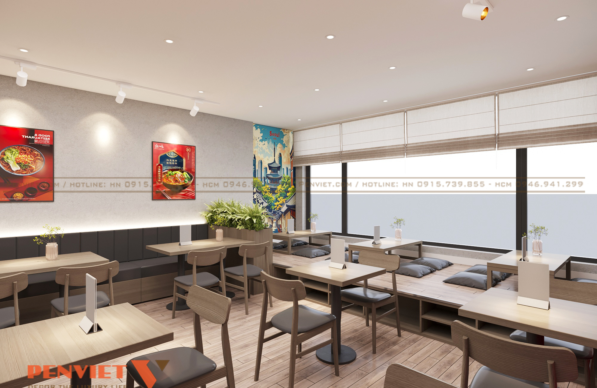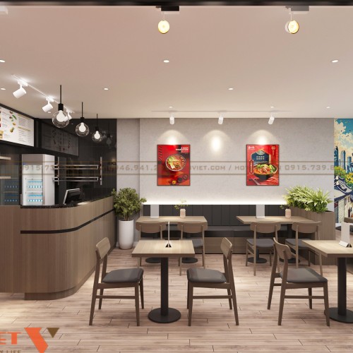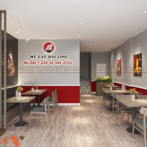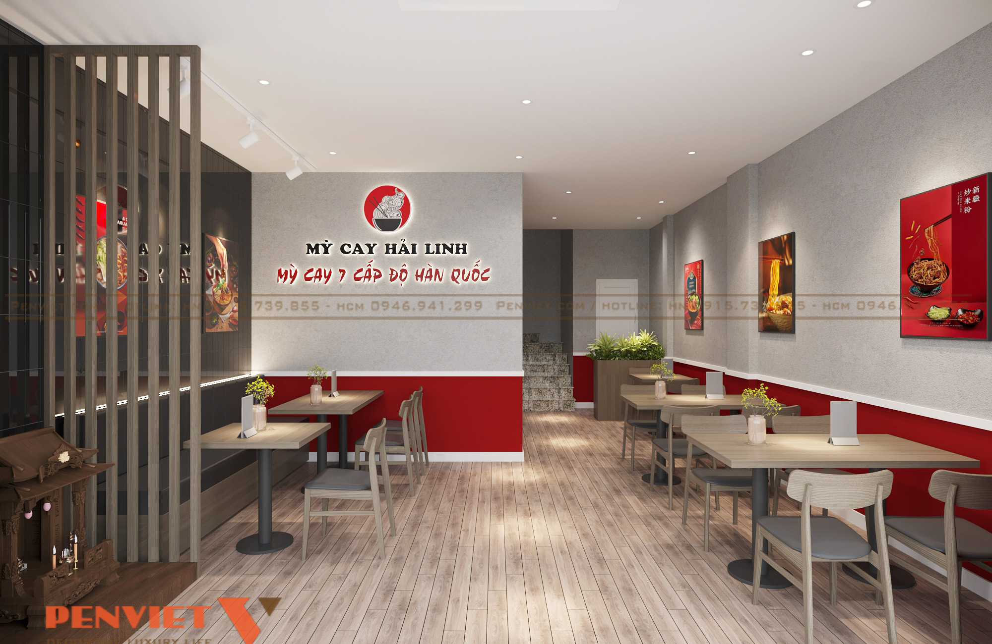 Trong xu hướng ẩm thực hiện nay, những quán mì cay Hàn Quốc đang ngày càng được yêu thích tại Việt Nam. Dự án thiết kế quán mì cay Hải Linh tại Thiên Lộc, Hà Nội chú trọng đầu tư vào không gian nội thất giúp chủ quán khẳng định thương hiệu, nâng cao hiệu quả kinh doanh. Với diện tích 100m2, đội ngũ kiến trúc sư đã khéo léo tạo nên một không gian vừa mang phong cách Hàn Quốc, vừa giữ được sự gần gũi, ấm cúng phù hợp với thị hiếu của khách Việt.