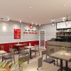 Phần tường được chia mảng rõ ràng: phía dưới sơn đỏ, phía trên là tông xám sáng, tạo cảm giác cân bằng và không bị bí bách. Những bức tranh món ăn treo xen kẽ không chỉ làm sinh động không gian mà còn đóng vai trò khơi gợi sự tò mò và kích thích khẩu vị khách hàng.