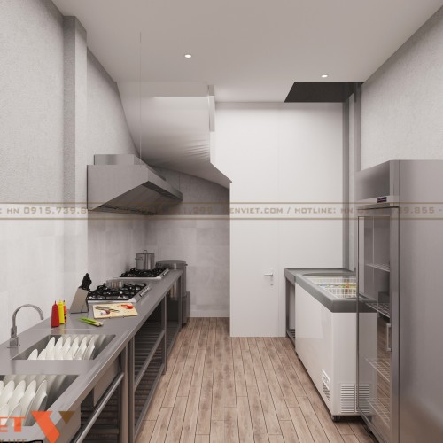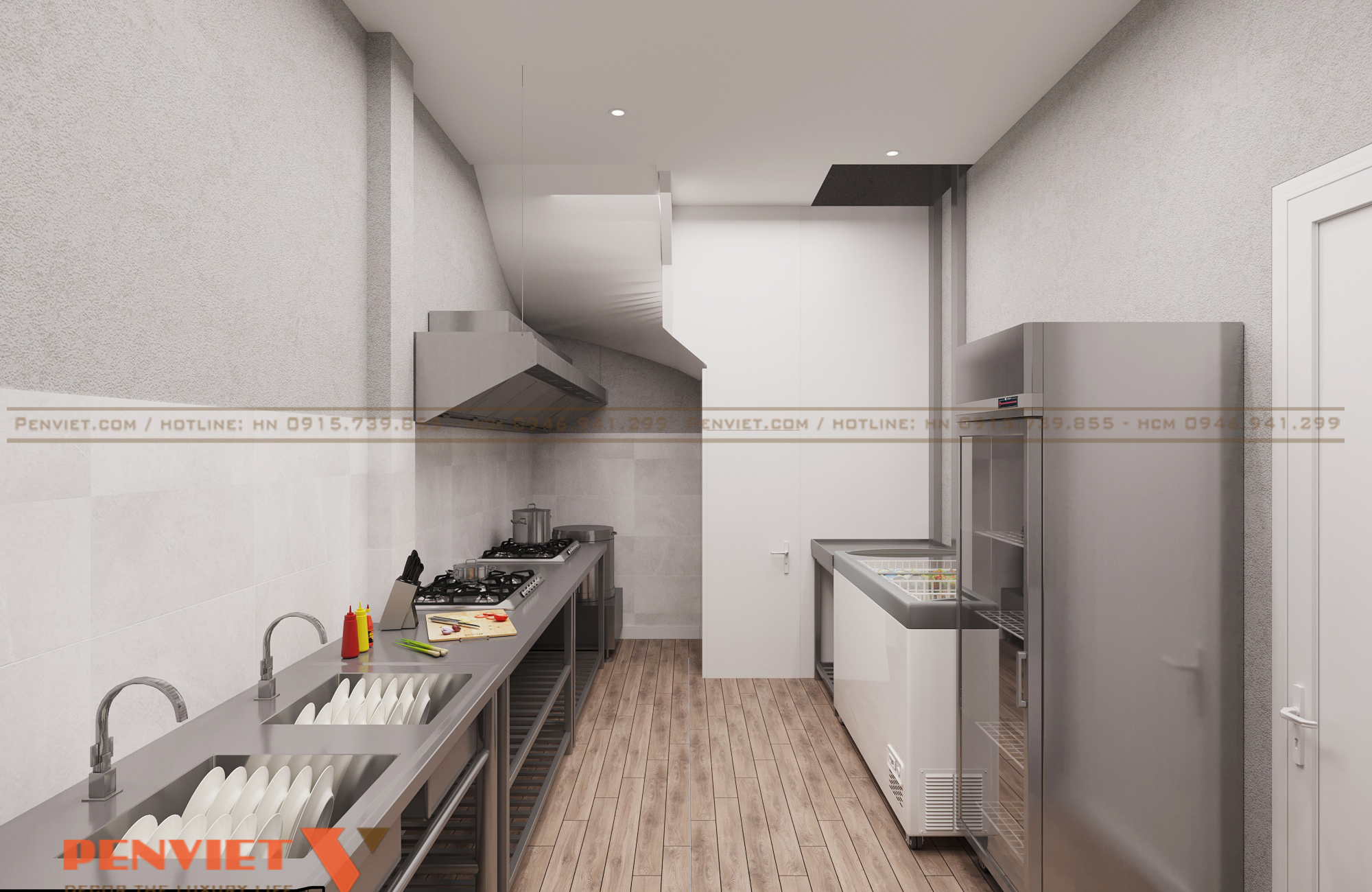 Đặc biệt, không gian tầng trệt được thiết kế mở với khả năng nhìn xuyên suốt, giúp khách hàng cảm thấy thoải mái và chủ quán dễ kiểm soát toàn bộ hoạt động. Đây là một ưu điểm lớn trong thiết kế quán ăn hiện đại, đặc biệt đối với những mặt bằng có chiều sâu như công trình này.