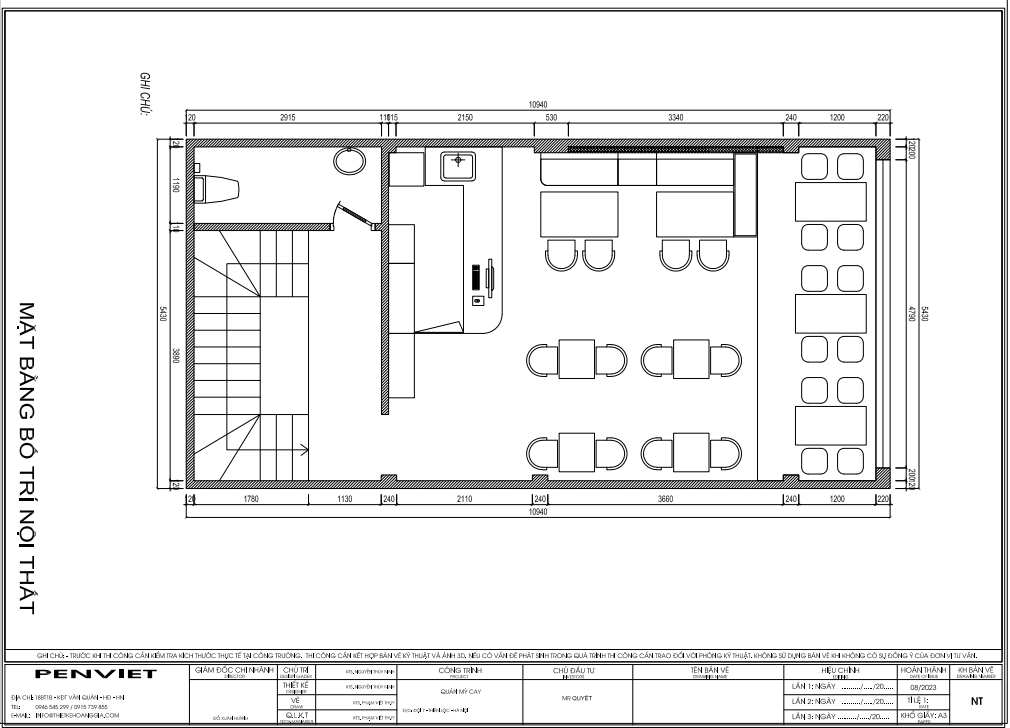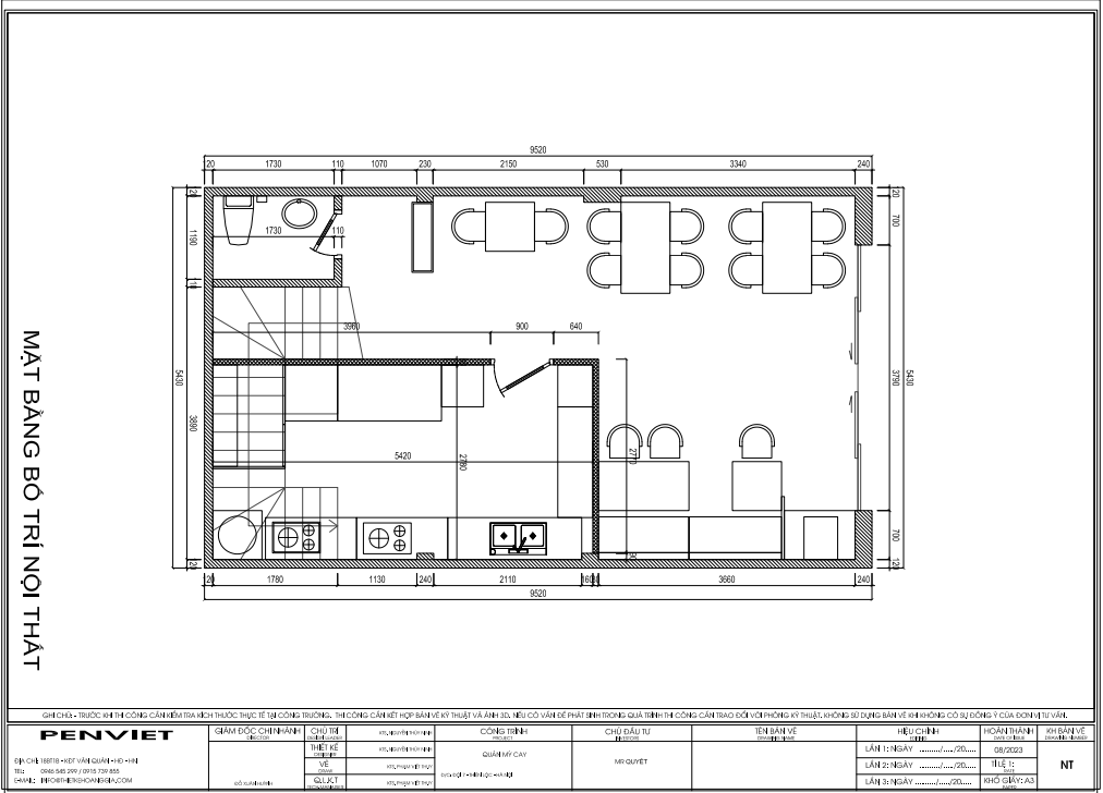 Không gian phục vụ khách được chia làm nhiều nhóm bàn nhỏ, phù hợp với đa dạng nhu cầu của khách hàng. Việc bố trí lối đi thông thoáng giúp nhân viên dễ dàng phục vụ, đồng thời mang lại cảm giác thoải mái khi khách ngồi dùng bữa.