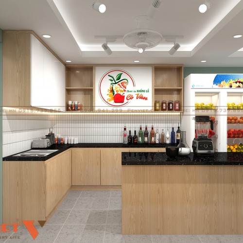 Dự án thiết kế quán nước của Chị Vân tại Hà Nội hướng đến không gian gọn gàng, dễ vận hành và tăng trải nghiệm khách hàng. Tổng thể sử dụng gam màu tươi sáng, bố cục khoa học và vật liệu bền. Các khu chức năng được phân tách rõ, giúp quy trình pha chế nhanh và hạn chế sai sót.