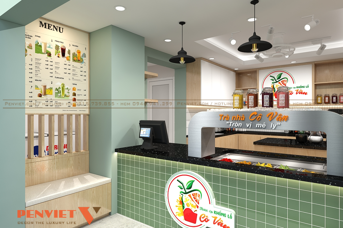 Menu treo tường bố trí rõ ràng, dễ đọc từ xa. Hệ đèn thả kết hợp đèn rọi tạo điểm nhấn ánh sáng. Khu topping đặt ngay phía trước, thuận tiện thao tác. Thiết kế này giúp giảm thời gian phục vụ và tăng hiệu suất bán hàng.