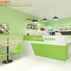 Khu vực quầy phá chế kết hợp thu ngân được đẩy về cuối cửa hàng giúp nhân viên dễ dàng bao quát toàn bộ không gian. Mẫu quầy làm từ gỗ MDF chống ẩm phủ Melamine phối màu lạ mắt này tạo được sự đồng điệu, thống nhất trong ý tưởng thiết kế quán trà sữa.