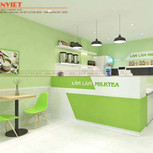 Chúng tôi lựa chọn mặt đá cho quầy thu ngân và pha chế kết hợp với kính bếp sơn màu để phù hợp với điều kiện sử dụng cũng như đảm bảo độ bền, tính thẩm mỹ cho nội thất. Các loại vật liệu này cũng khiến cho việc lau dọn được dễ dàng, góp phần đảm bảo an toàn vệ sinh thực phẩm, khiến người tiêu dùng an tâm hơn khi đến với tiệm trà sữa Lâm Lâm.