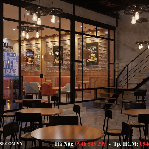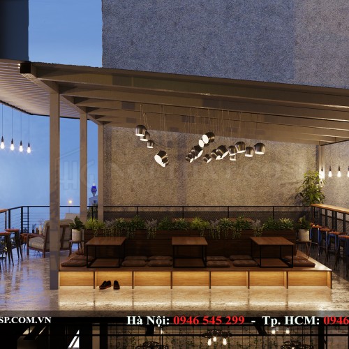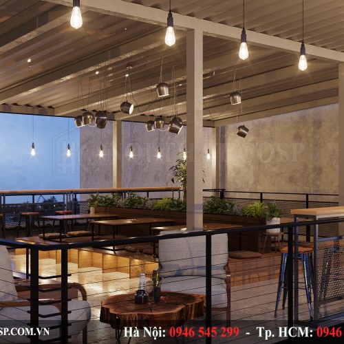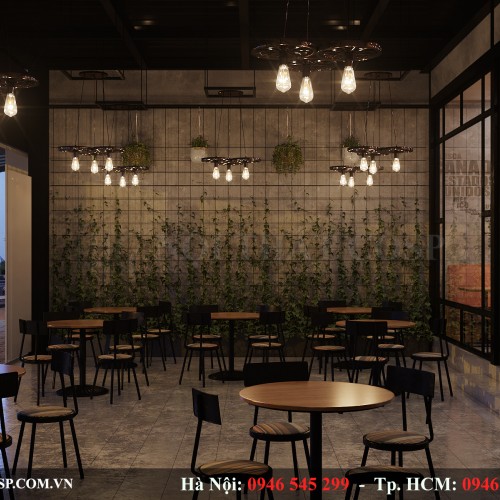 Mặt tường đối diện cầu thang sẽ được thiết kế hệ thống giàn dây leo và cây cảnh phủ xanh tảo không gian thiên nhiên cho quán.