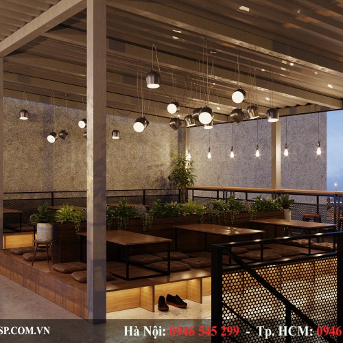 Chỉ một phần nhỏ hệ thống bàn dài được đặt khu vực chính giữa quán. Và tại đây, chúng tôi cũng thiết kế một khung gỗ trồng cây cảnh có diện tích tương đương với khung cây cảnh tại tầng 1.
