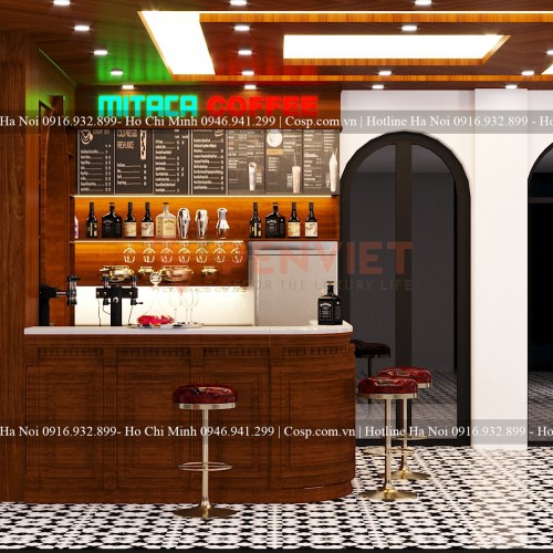 Cũng chỉ sử dụng những chất liều đơn giản thôi nên nếu khách hàng thi công shop chúng tôi sẽ hoàn thiện toàn bộ dự án trong thời gian ngắn nhất. Nội thất bao gồm quầy pha chế chính, quầy pha chế gần cửa sổ, kệ để đồ + menu, ghế quầy bar.