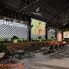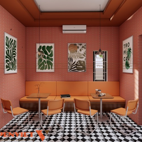 Khu vực phục vụ chính được thiết kế theo dạng không gian mở. Bàn ghế được sắp xếp thành nhiều cụm nhỏ giúp tăng số lượng chỗ ngồi mà vẫn đảm bảo lối đi rộng rãi. Cách bố trí này phù hợp với các quán cafe có lượng khách thay đổi theo khung giờ.