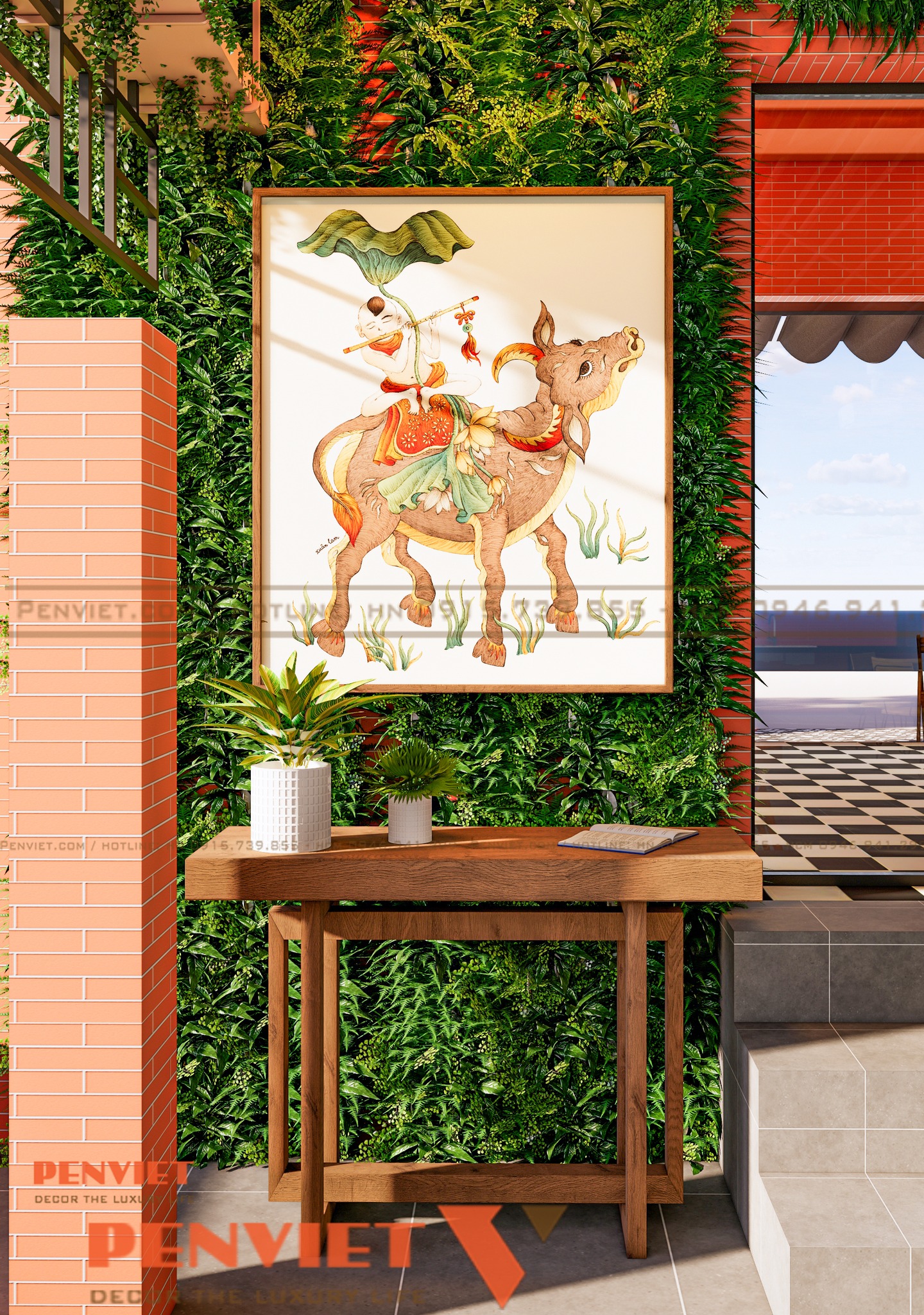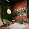 Phía dưới mảng tường trang trí được bố trí băng ghế dài kết hợp cây xanh. Giải pháp này vừa tiết kiệm diện tích vừa tạo cảm giác gần gũi. Không gian vì thế trở nên mềm mại và có chiều sâu hơn.