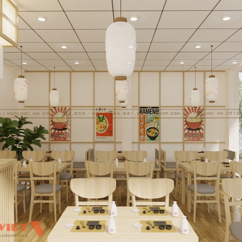 Ngoài ra chi tiết điểm nhấn của thiết kế quán ăn Nhật Bản đó là các đèn lồng treo. Đèn lồng giấy in họa tiết hoa anh đào được treo với độ cao vừa phải để trang trí và cung cấp ánh sáng dịu nhẹ cho không gian. Ngoài ra còn có các đèn rọi chiếu sáng tập trung xuống bàn ăn, vừa làm nổi bật món ăn vừa tăng sự hấp dẫn thị giác.