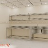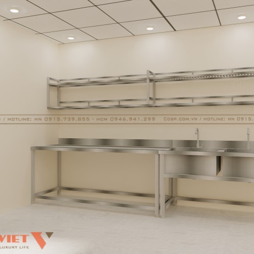 Bếp được bố trí khoa học với các thiết bị hiện đại và hệ thống hút mùi hiệu quả, đảm bảo không gian quán luôn sạch sẽ và thông thoáng. Một quầy lễ tân phục vụ nhỏ được đặt gần bếp và khu vực đón khách giúp nhân viên dễ dàng mang món ăn đến cho khách mà không ảnh hưởng đến không gian di chuyển.