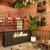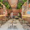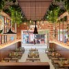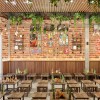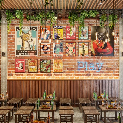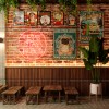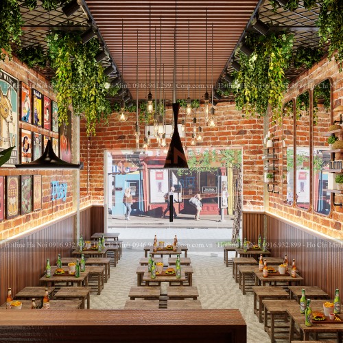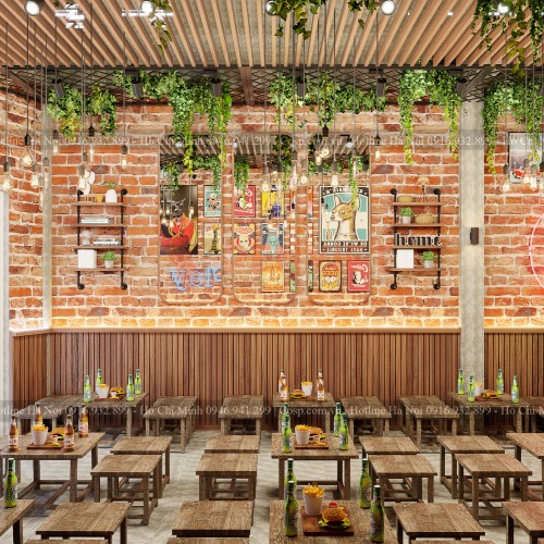 Bên cạnh việc sử dụng giấy dán tường với mẫu giả gạch thô thì điều làm nên thành công cho thiết kế tiệm đồ ăn này đó chính là yếu tố ánh sáng. Bộ đèn thả trần decor với 10 bóng đèn các loại được đưa vào sử dụng giúp mang đến một không gian ăn uống rất chill.