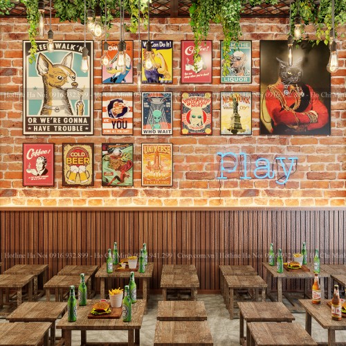 Trên bức tường gạch các sản phẩm decor không gian được sử dụng rất phong phú. Một loạt những bức tranh in lụa khung nhựa với kích cỡ to nhỏ khác nhau được sắp xếp theo một phong cách rất riêng trên tường. Một chiếc kệ trưng bày nhỏ treo tường bằng khung ống sắt cùng các đợt gỗ MDF chống ẩm phủ Melamine để bày một vài sản phẩm trang trí nhỏ xinh như tượng hay chậu cây cảnh.