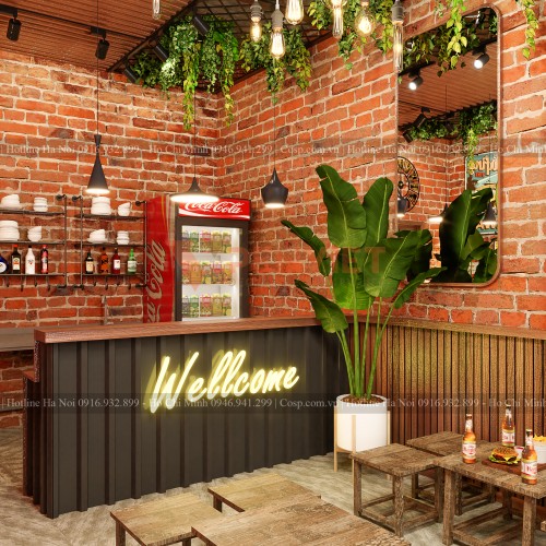 Chiếc quầy pha chế này được làm bằng khung gỗ MDF chống ẩm phủ Veneer với mặt trước phun sơn và các hộc tủ cánh mở ở phía sau. Bộ chữ “Welcome” bằng đèn led neon cũng được gắn vào mặt trước của quầy để tránh cảm giác trống trải mà thể hiện được sự nhiệt tình, luôn hoan nghênh khách hàng của quán.