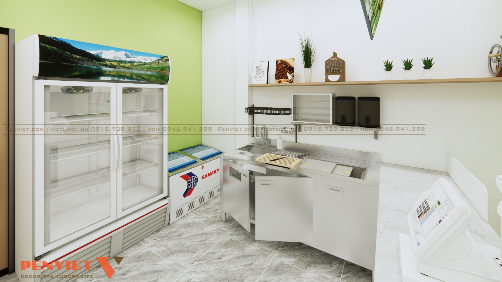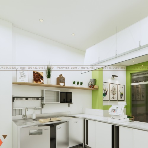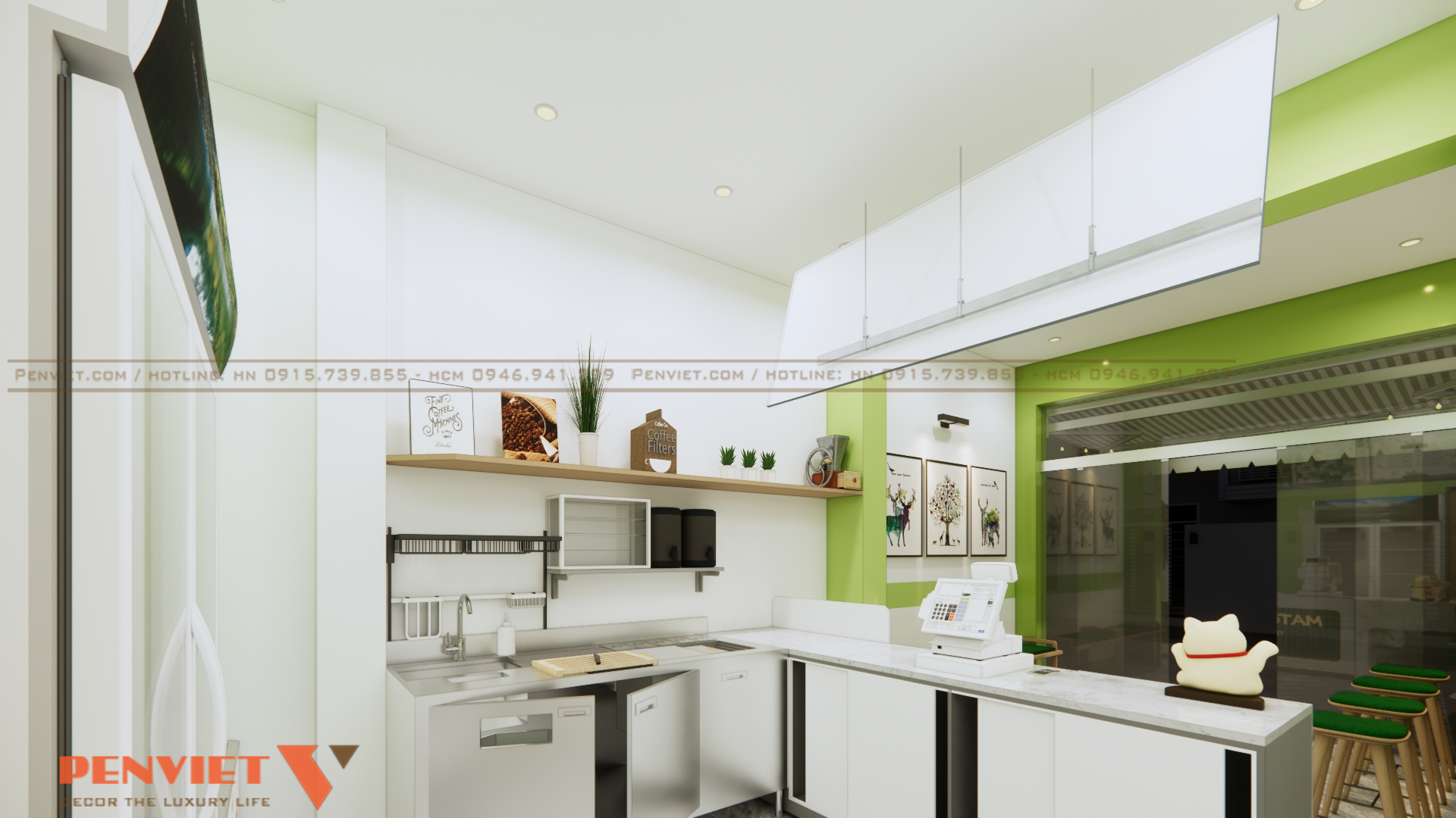 Không gian bên trong được tối giản chi tiết để tránh cảm giác chật. Tông màu sáng kết hợp ánh sáng trắng giúp tiệm luôn tươi và sạch. Đây là hướng đi phù hợp với các cửa hàng nhỏ tại khu dân cư hoặc tuyến phố đông người.