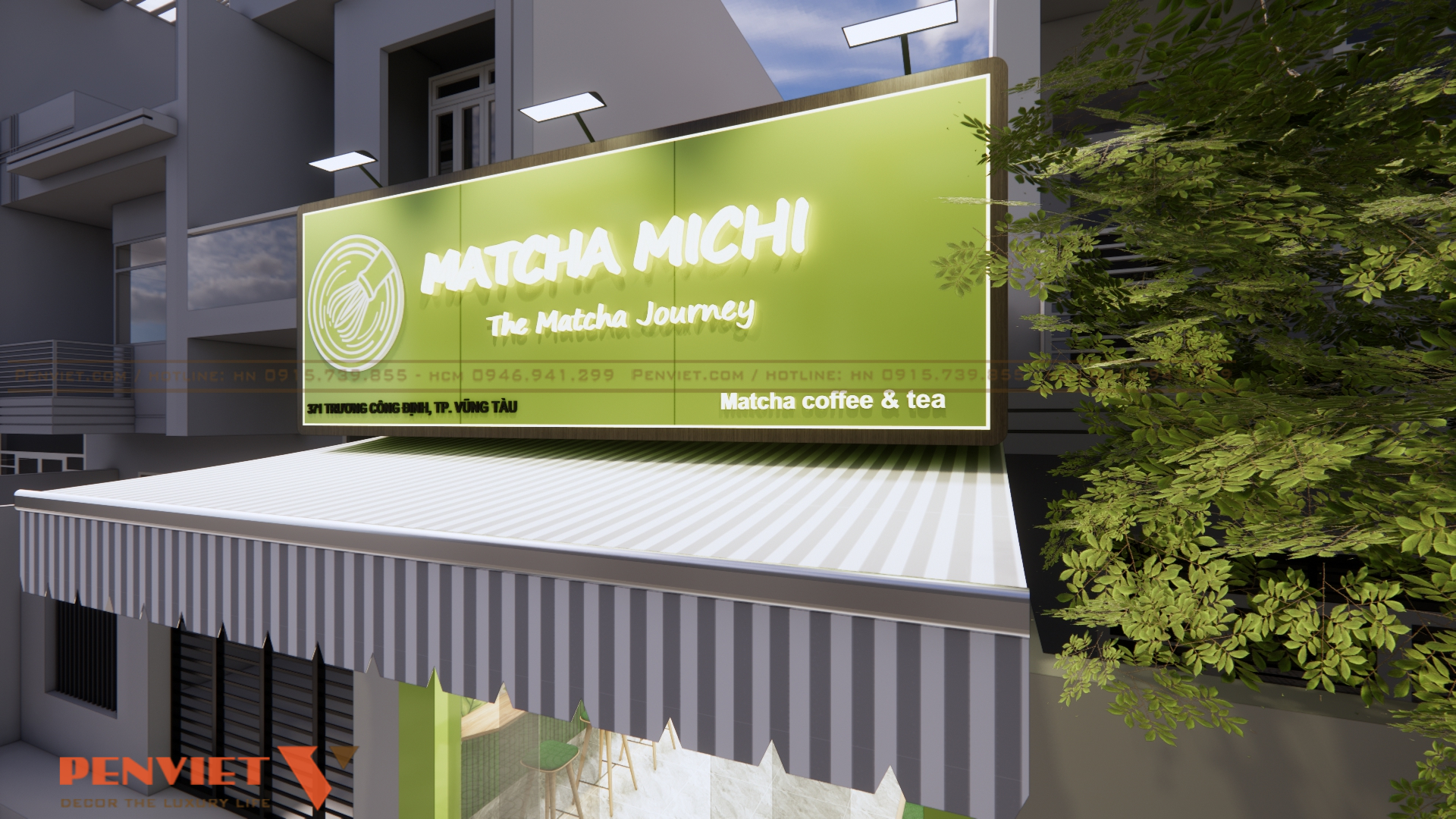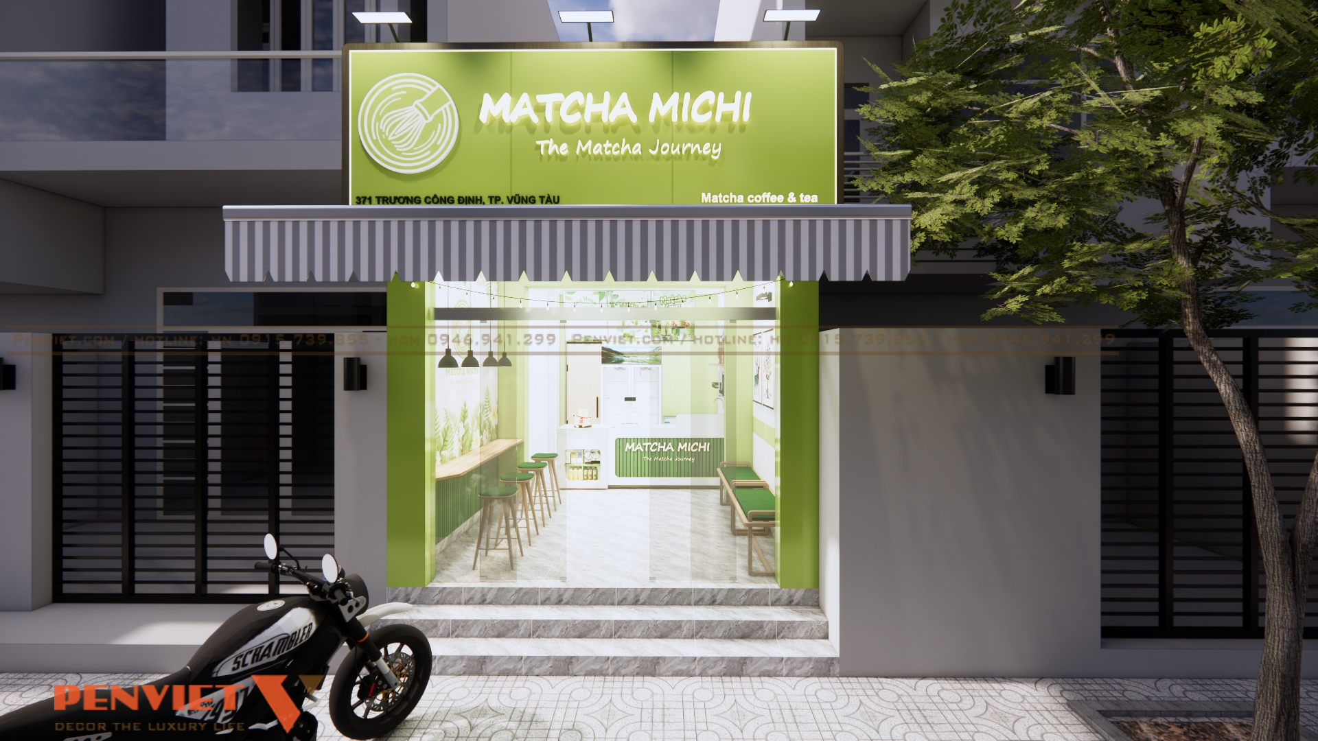 Thiết kế lấy cảm hứng từ matcha với gam xanh làm chủ đạo. Mặt tiền được xử lý nổi bật, dễ thu hút người đi đường. Bảng hiệu lớn, rõ ràng giúp tăng khả năng nhận diện thương hiệu từ xa.