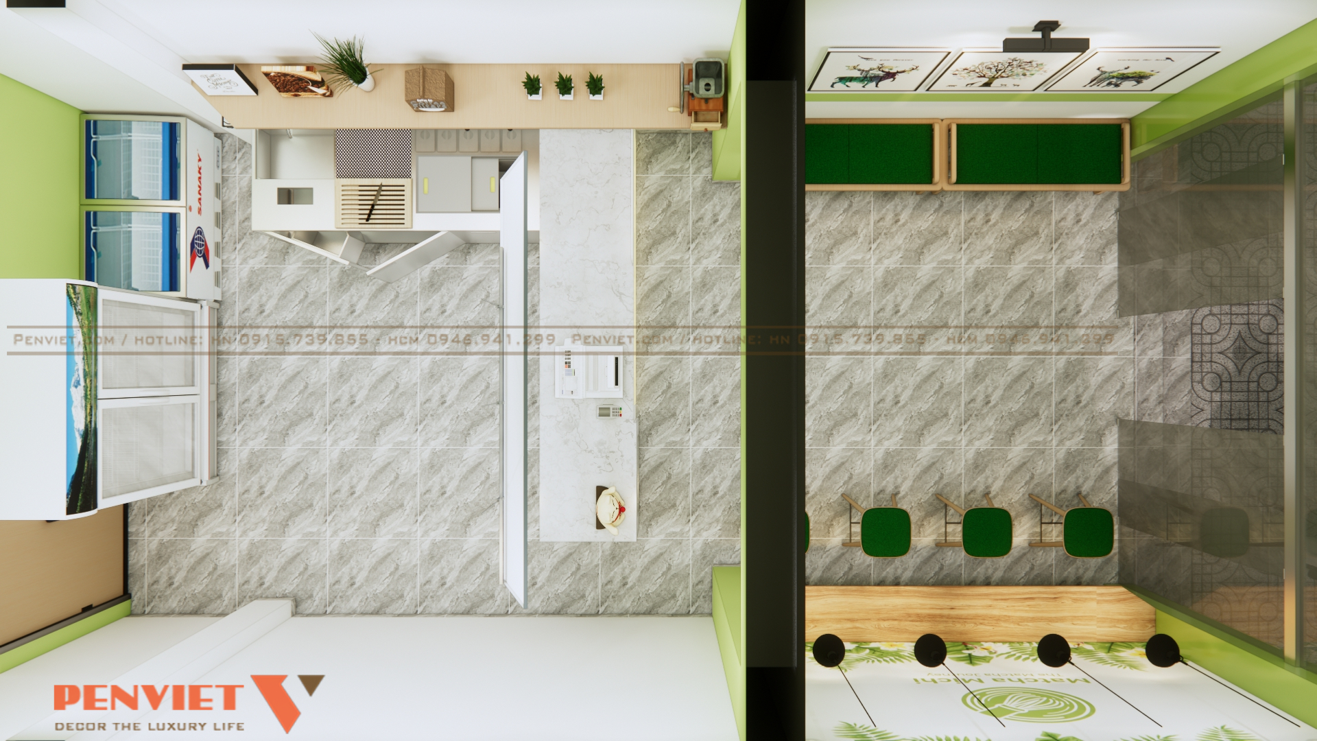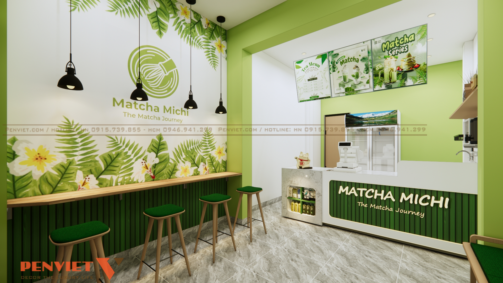 Màu xanh matcha được sử dụng xuyên suốt từ mặt tiền đến nội thất. Họa tiết lá cây trên tường tạo cảm giác gần gũi và trẻ trung. Logo thương hiệu được đặt nổi bật, dễ ghi nhớ.