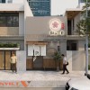 Điểm nhấn nổi bật nhất trên mặt tiền chính là biển bảng quảng cáo thiết kế theo phong cách Nhật. Kết hợp logo hình hoa anh đào cách điệu màu hồng phấn với dòng chữ tên nhà hàng “Okii - D” được đặt khéo léo bên dưới. Tên nhà hàng được trình bày bằng font chữ tối giản, sang trọng, giúp tăng độ nhận diện và dễ ghi nhớ.