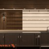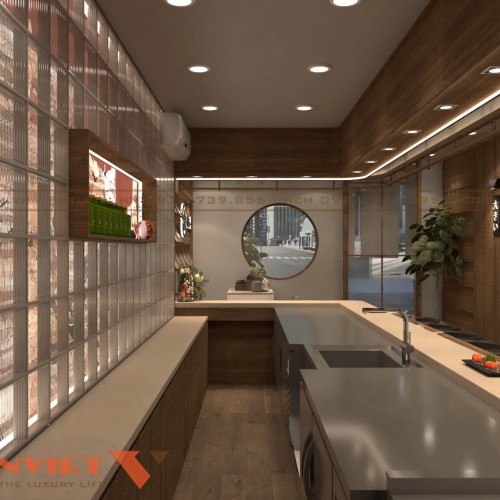Hệ vách ngăn kính mờ kết hợp với khung gỗ ở phía sau bếp tạo chiều sâu và sự riêng tư nhưng không gây cảm giác chia cắt. Trên đó là hình ảnh sơn thủy Nhật Bản được in trên kính, vừa trang trí, vừa truyền tải văn hóa tinh tế.