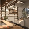 Logo hình hoa anh đào xuất hiện không chỉ trên biển hiệu mà còn được in trên rèm cửa, tường bên trong, menu… tạo nên một hệ thống nhận diện xuyên suốt, nhất quán và chuyên nghiệp.