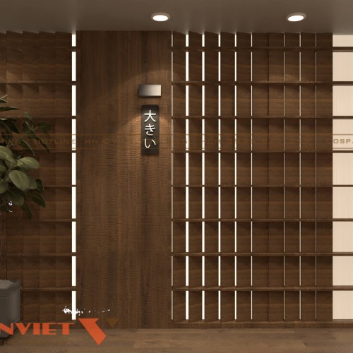 Ngay bên cạnh logo là hai khung chữ Nhật in nổi bật trên nền đỏ, tạo cảm giác vừa truyền thống, vừa hiện đại. Hệ thống đèn chiếu sáng âm tường giúp biển hiệu rực rỡ về đêm nhưng vẫn giữ được sự thanh thoát, không phô trương. Ngoài ra, chi tiết rèm noren trắng riêng tư treo ngay lối vào là dấu ấn đặc trưng của các nhà hàng Nhật Bản.