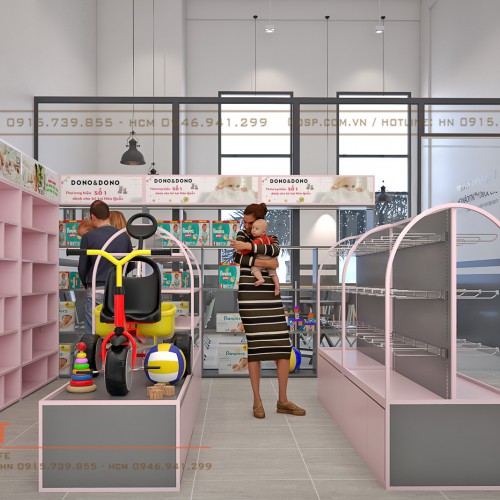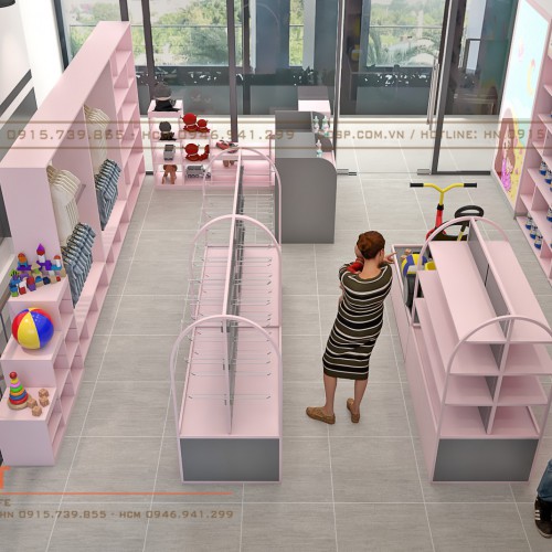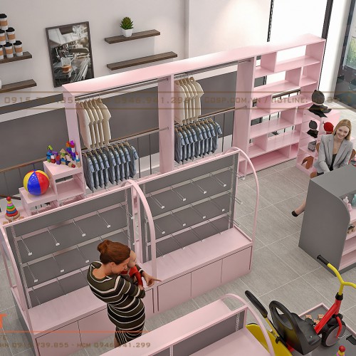 Với các mặt hàng thời trang cho bé, chúng tôi bố trí kệ trưng bày đặt áp tường với chất liệu gỗ MDF phủ melamine và các khung inox giúp tiết kiệm tối đa chi phí cho chủ đầu tư mà vẫn tôn lên vẻ đẹp cho các mặt hàng và không gian của tiệm.