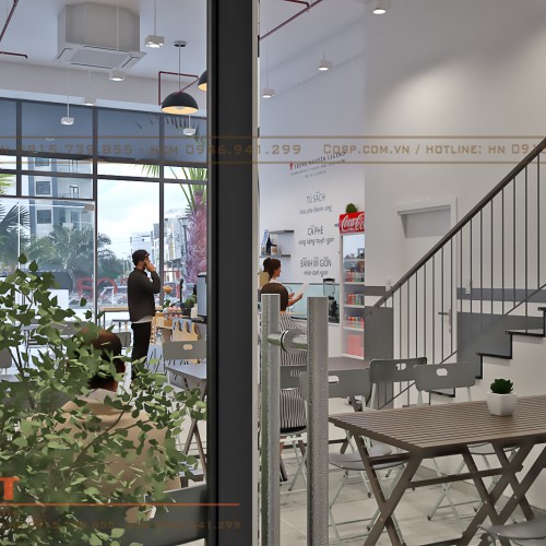 Để tiếp cận tối đa các đối tượng khách hàng ghé thăm cửa tiệm, các kiến trúc sư của Penviet tư vấn giúp chủ đầu tư tạo không gian hoàn toàn mới trên tầng lầu, “biến hóa” phần không gian phía bên ngoài là nơi yên tĩnh để giúp khách hàng vừa có thể thưởng thức cafe, vừa có cơ hội được thư giãn, đọc sách, làm việc. Chúng tôi trang trí vách decor bằng gỗ MDF phủ laminate vân gỗ phù hợp với công năng sử dụng, cũng như đảm bảo sự tinh tế cho toàn bộ không gian.
