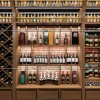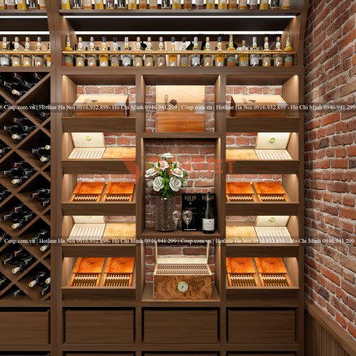 Phần chân tủ trưng bày là những ngăn tủ nhỏ có ray kéo. Phần khu vực này để dụng cụ hoặc những chai rượu khác. Hai bên tường được trang bị loại tủ này khiến cho showroom rượu đầy đủ mọi công năng.