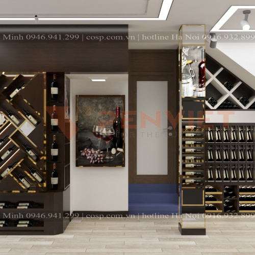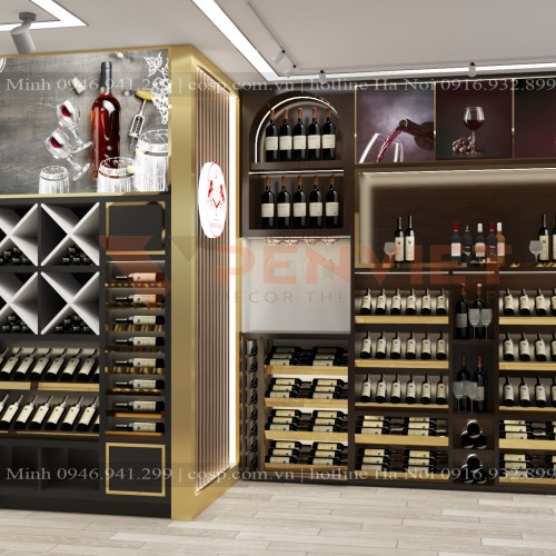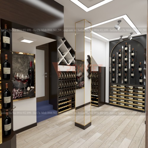 Phong cách thiết kế: sang trọng + điểm nhấn viền inox mạ vàng. Màu sắc thường sử dụng cho showroom rượu là màu trầm, màu nâu gỗ bởi nó phù hợp với màu của những chai rượu là các màu đậm như xanh, đen, nâu. Sự phối hợp của những gam màu này hình thành một mảng màu nghệ thuật nổi bật, sang trọng và ấn tượng, cũng vô cùng ấm áp, trang nhã. Đó là hiệu ứng màu sắc mà bất cứ nhà thiết kế nào cũng nắm rõ và tận dụng khi muốn tạo một không gian sang trọng, cởi mở.