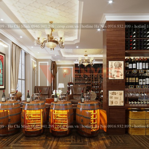 Những chiếc kệ đứng giữa nhà còn được thiết kế mô phỏng theo hình chai rượu vang tạo nên nét ấn tượng và khác biệt lớn cho shop rượu. Hay những chiếc bàn đứng được mô phỏng theo kiểu dáng của các thùng gỗ đựng rượu trông rất độc đáo.