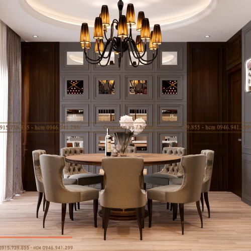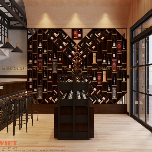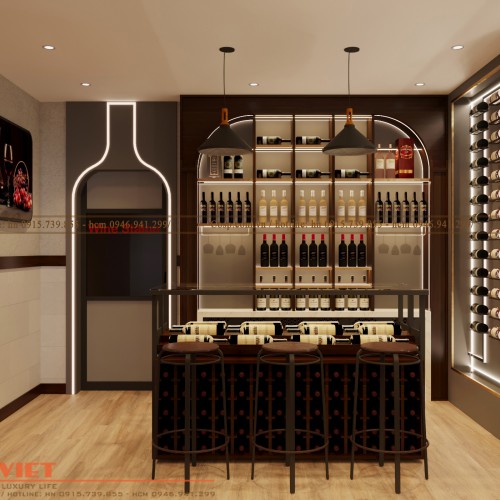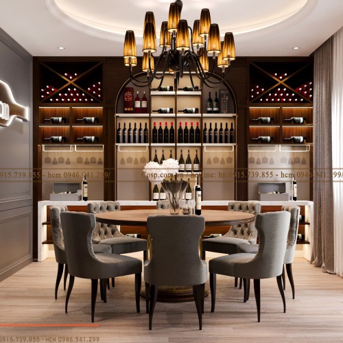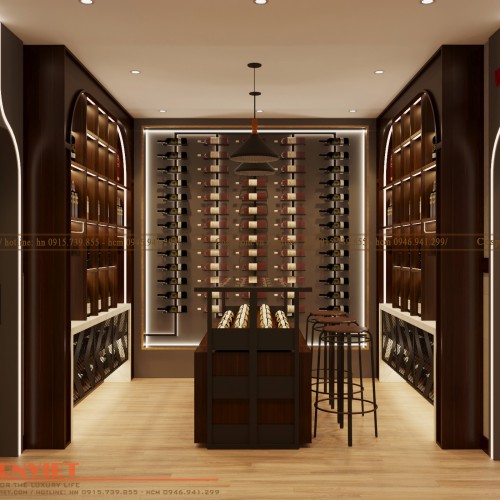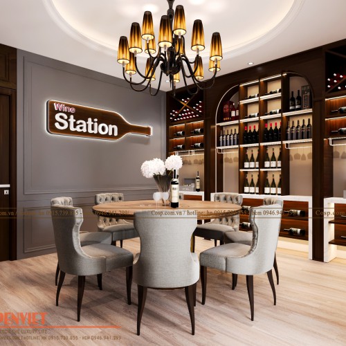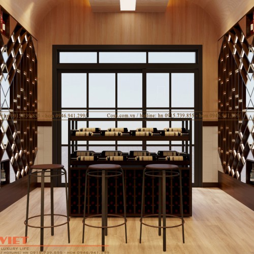 Từng chi tiết thiết kế của phòng thử rượu như vách tường, bố trí logo, tủ trưng bày rượu viền inox sang chảnh, bộ bàn ghế thử rượu cao cấp, đèn thả kiểu cách kết hợp hài hòa tạo nên tổng thể không gian Sang – Chất – Cao Cấp.