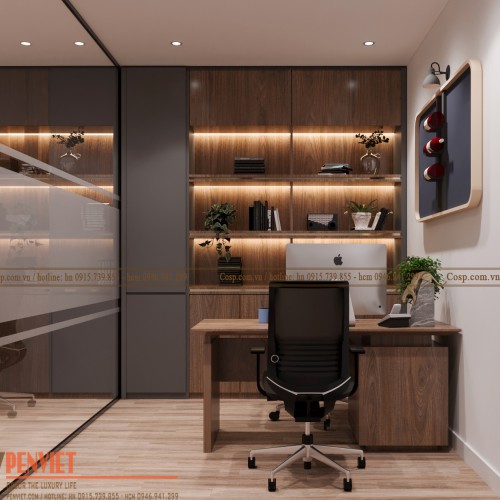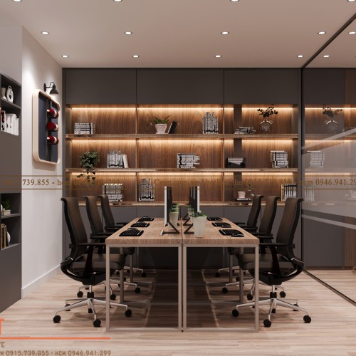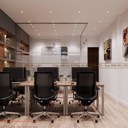 Hệ nội thất được sử dụng trong thiết kế văn phòng làm việc bao gồm: bàn làm việc giám đốc, bàn ghế làm việc của nhân viên, tủ tài liệu cao sát tường, tủ tài liệu thấp…