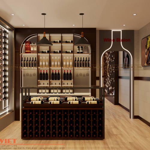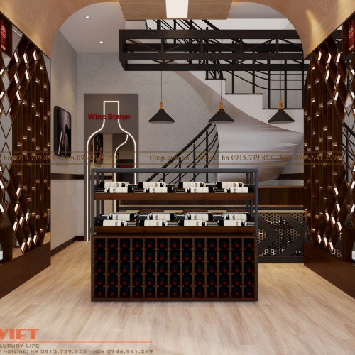 Thiết kế nội thất showroom rượu Wine station với phong cách thiết kế sang trọng, cao cấp và hiện đại. Bố cục nội thất khu vực trưng bày sản phẩm logic, khoa học và phù hợp với diện tích showroom nhưng vẫn bảo đảm không gian thông thoáng và lối đi rộng rãi trong cửa hàng.